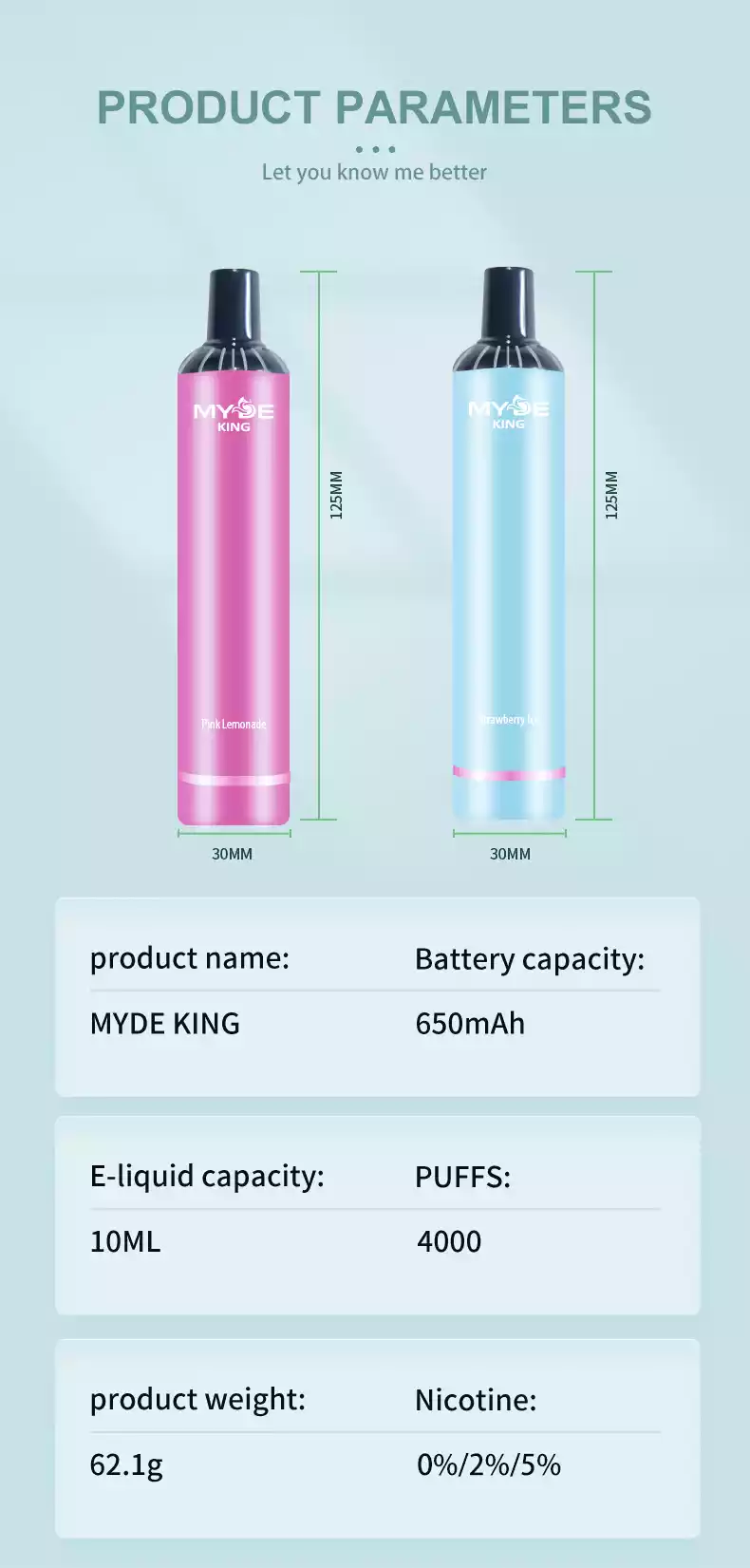 Die MYDE King 4000 Puffs Einweg-E-Zigarette enthält Nikotin, das die Gesundheit schädigen und zu einer Sucht führen kann. Nur für Erwachsene geeignet.