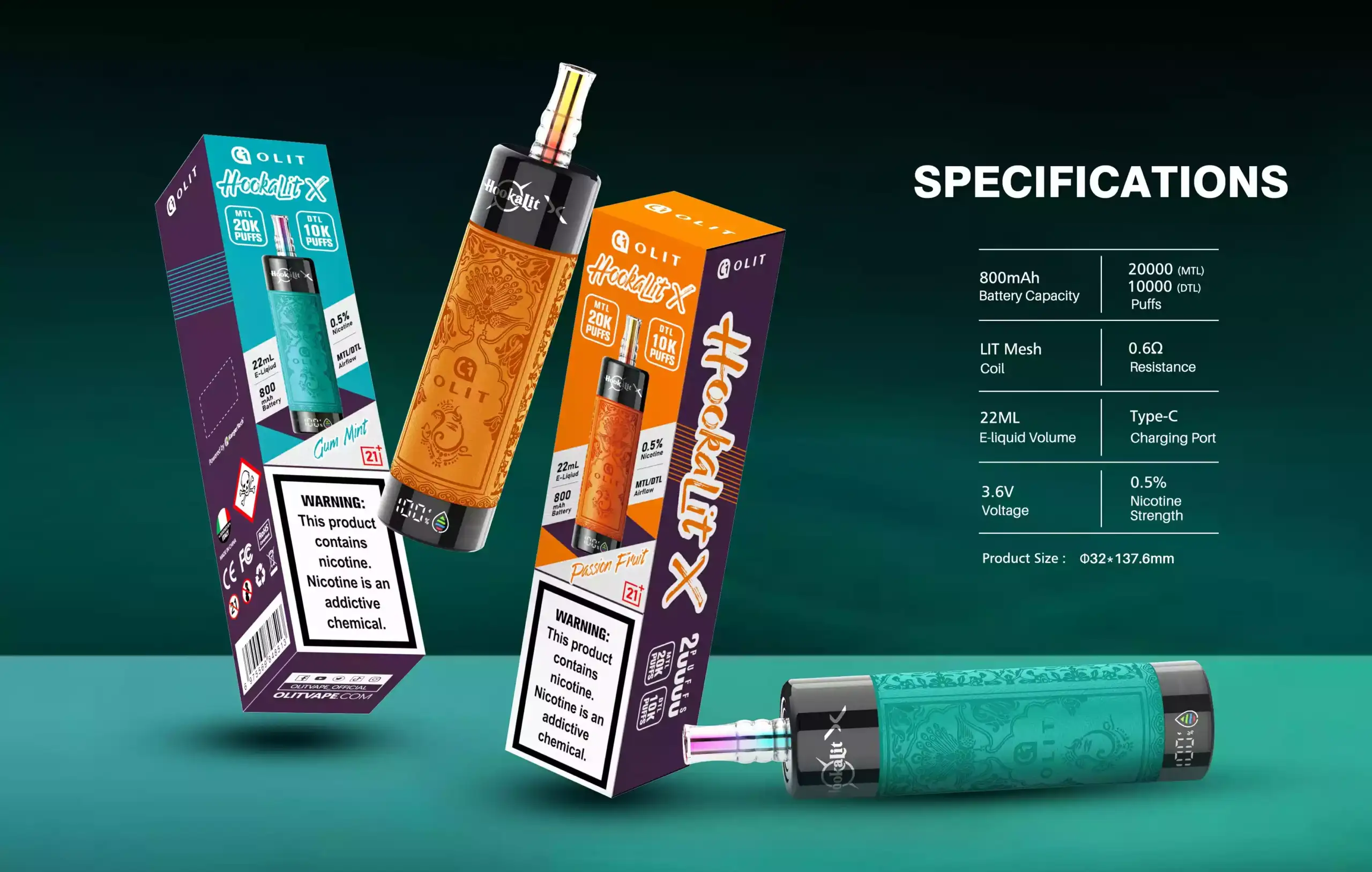 Die OLIT HOOKALIT X 20000 Puffs Einweg-E-Zigarette enthält Nikotin, das gesundheitsschädlich sein und zu einer Sucht führen kann. Nur für Erwachsene geeignet.